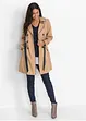 Feminin trenchcoat med jakkeslag, dobbelknappet list og lekre skinnimitasjons-detaljer. Trenchcoaten har et utsvinget snitt, med belte som markerer midjen. Lengde i str. 38, ca. 90 cm.
